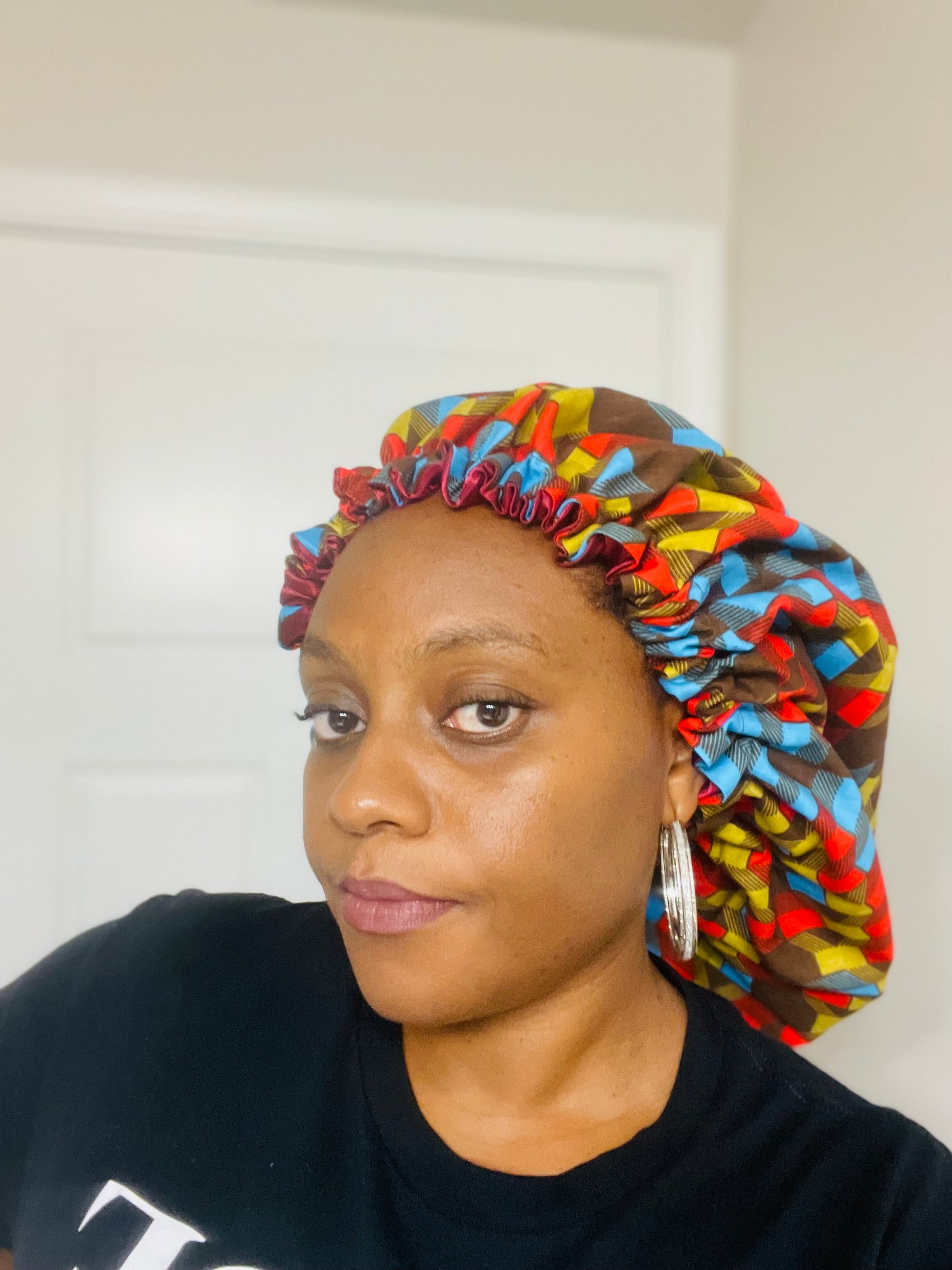 Handcrafted African Hair Bonnets made from vibrant African Ankara fabric and lined with ultra-soft satin .